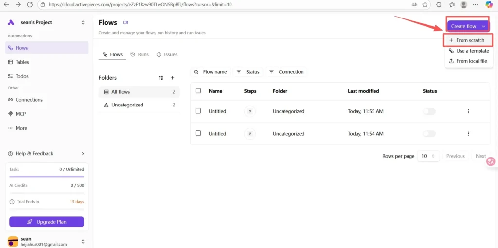 選擇 從頭開始 (對話方塊中通常會列出範本-選擇空的「scratch」選項來設計自訂流程)。這將打開流程建構器畫布。 (Activepieces 文件和教學課程中,New Flow → From Scratch 流程是常用的模式。)