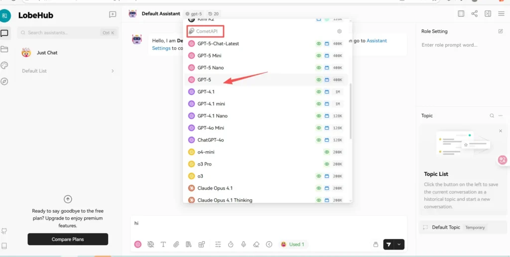 選擇CometAPI的某款機型進行測試,在Lobe-Chat輸入簡單的測試指令。呼叫成功會收到對應的回覆;失敗請檢查配置是否正確或聯絡cometapi線上客服。